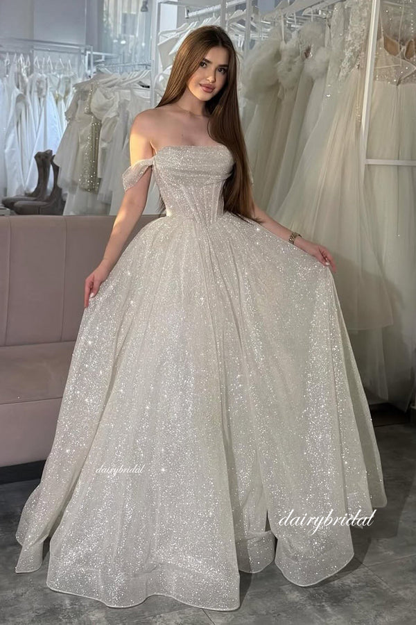 New Sparkle A-line Off Shoulder White Backless Prom Dresses, DB107